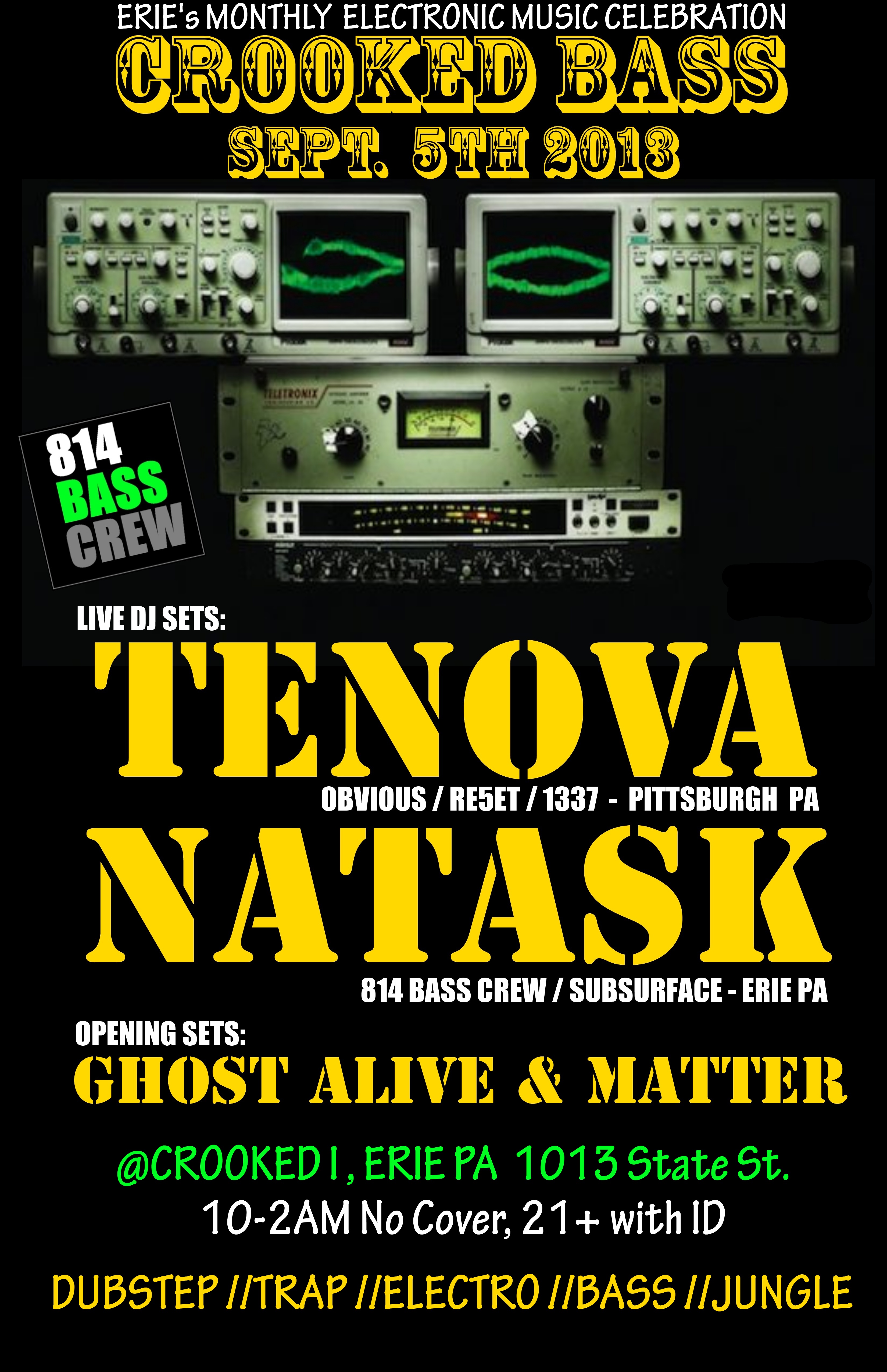 Sept. 5th  CROOKED BASS featuring TENOVA.   Billed at one of the Premiere EDM monthly events in the North Eastern part of the US, showcasing the world top talent LIVE from the CROOKED I.  1013 State Street ERIE PA.   and also LIVE via The Bass Blog…. BASS BLOG TV.   on USTREAM.